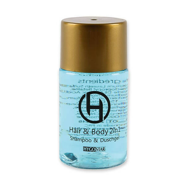 Le shampooing et le gel douche d'hôtel "Hair & Body" sont conservés de manière hygiénique dans une petite bouteille avec bouchon à vis - un petit emballage de 25 ml idéal pour vos clients d'hôtel.