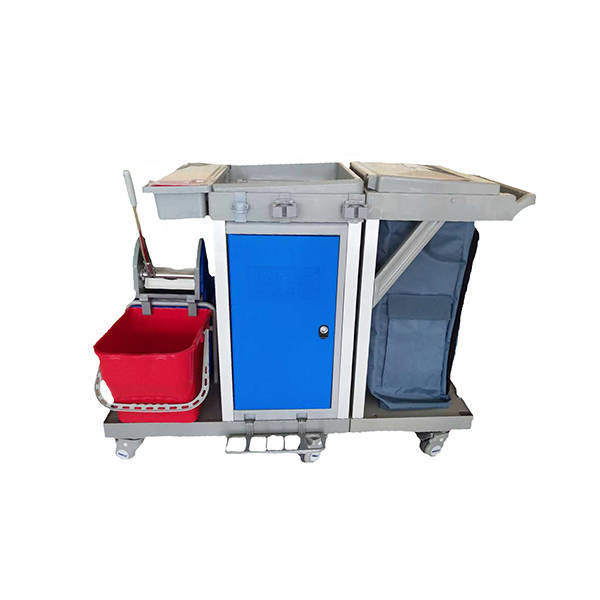 1 x Reinigungswagen mit sechs geräuschlosen Laufrollen, einen Abfallsack, eine abschliessbare Türe für die Mittelfächer